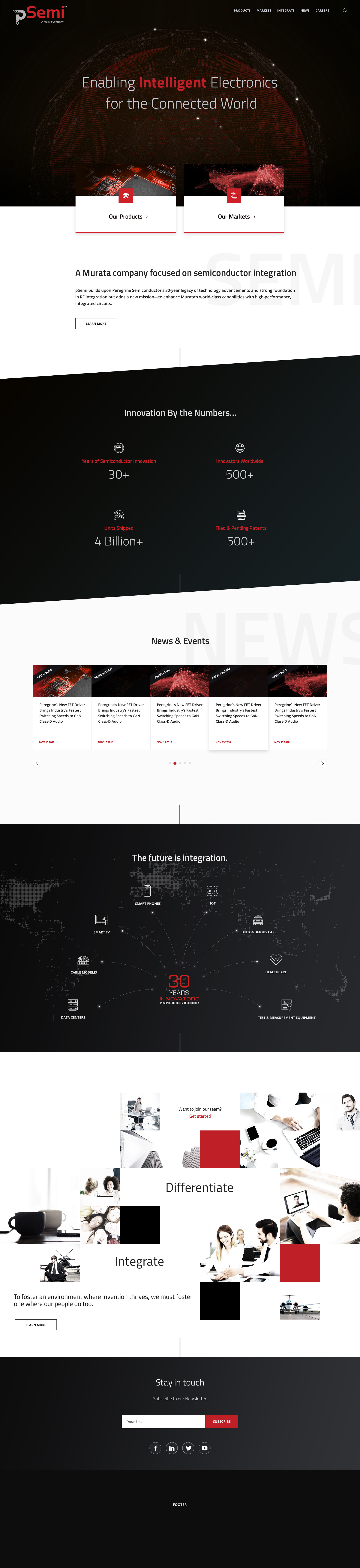 A Murata Company Focused on Semiconductor Integration pSemi builds upon Peregrine Semiconductor’s 30-year legacy of technology advancements and top-ranked intellectual property (IP) portfolio but adds a new mission—to enhance Murata’s world-class capabilities with high-performance semiconductors. We are proud to be a part of the over 70,000 Murata employees who are shaping the future of electronics. I partnered with a San Diego based agency to design a new responsive website